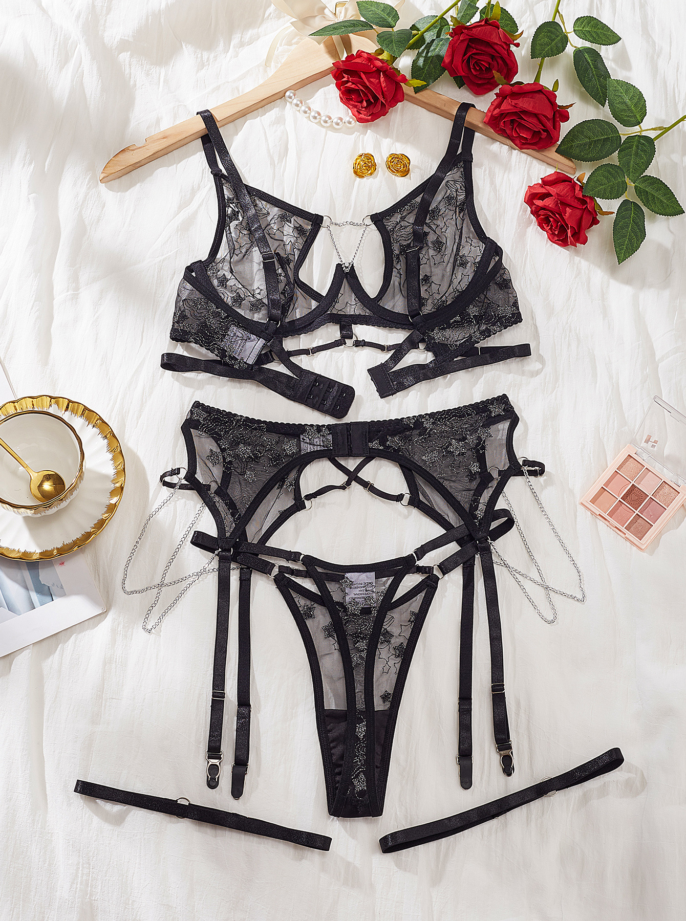Bra Set Complex Craft Starry Embroidery Hollow Out Cutout Chain Sexy Underwear Four Piece Set